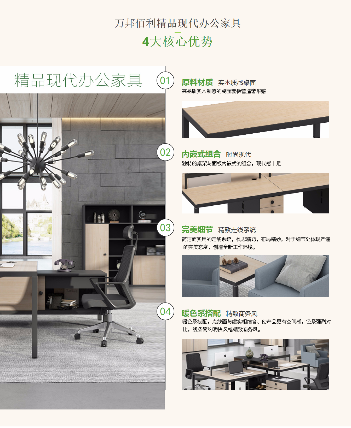 北京萬邦佰利家具有限公司是一家專注于辦公家具生產、批發銷售的公司。銷售的產品有:班臺、經理桌椅、會議桌椅、員工桌椅、文件柜、密集柜、視屏會議桌、辦公沙發、學校家具、銀行家具、戶外家具、醫院家具等產品,公司自成立以來始終堅持以人才為本、誠信立業的經營原則,堅持用企業文化提升企業核心競爭力,使企業在發展中處于良好的形象.我公司主要服務于企業單位的家具定制服務,為各大企業量身定做整體環境的家具設計全程服務,我們的整體產品服務...